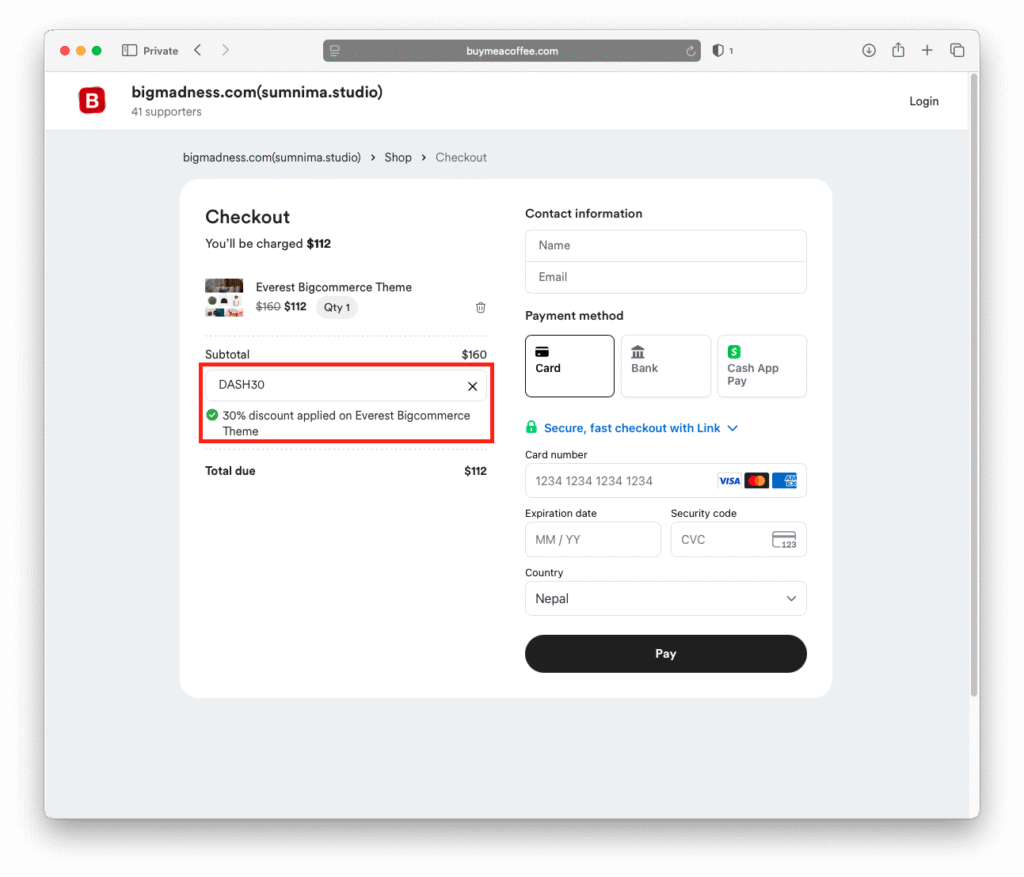 - On Buy Me a Coffee, add the theme to your cart and pay using card, bank, or Cash App Pay. If a discount code is available, don’t forget to grab it and paste it in the “Add Discount Code” field.